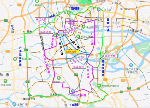 (2)过渡区(珠江隧道-洛溪大桥):北至中山路,南至汉溪大道,西至环城高速-龙溪大道,东至广州大道。