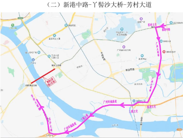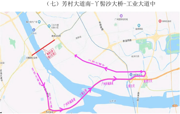 (3)核心区(洲头咀隧道-丫髻沙大桥):工业大道→洲头咀隧道→芳村大道→东沙大道→环城高速→丫髻沙大桥。