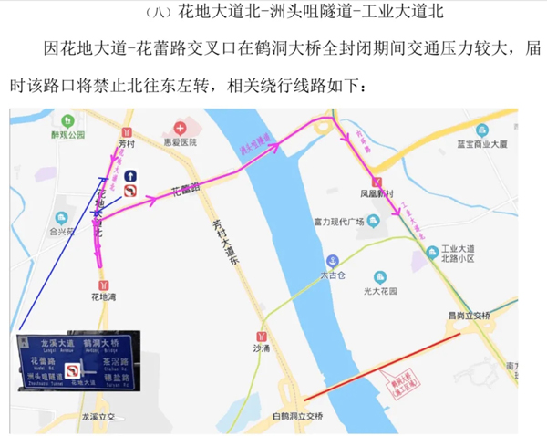因花地大道-花蕾路交叉口在鹤洞大桥全封闭期间交通压力较大,届时该路口将禁止北往东左转,相关绕行线路如下: