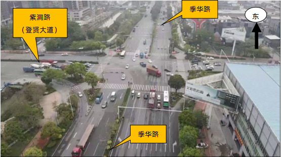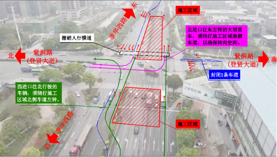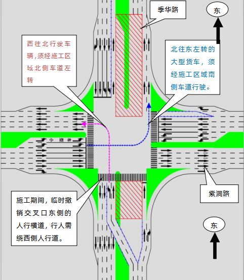 3、行人、非机动车:施工期间,临时撤销交叉口东侧的人行横道,行人需绕行西侧人行道穿过季华路。
