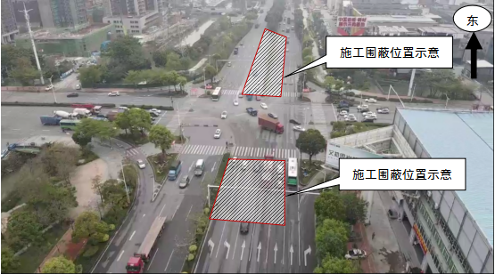 1、东往西方向:调整原来的车道数量,保留2条左转(大型货车左转须经施工区域南侧车道行驶)、2条直行车道、1条右转弯车道。