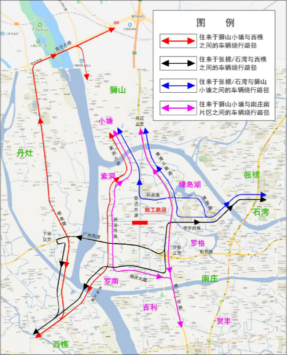 4、往来于张槎、石湾与狮山小塘的车辆:可绕行禅港路、科润路经紫洞大桥前往,或绕行佛山一环路、佛清从高速经务庄立交前往。