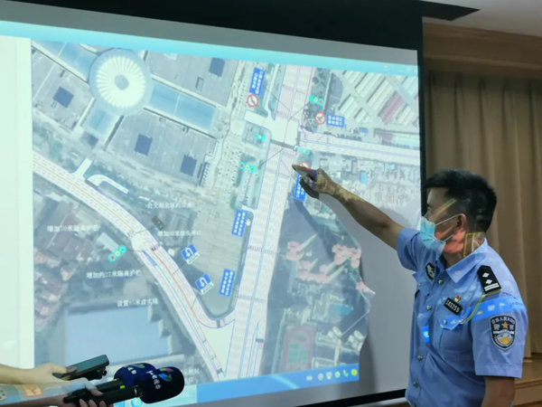 市公安局禅城分局交警大队宣教交管室副主任丁泽政讲解方案细节。
