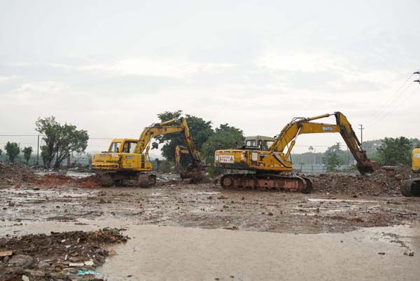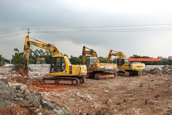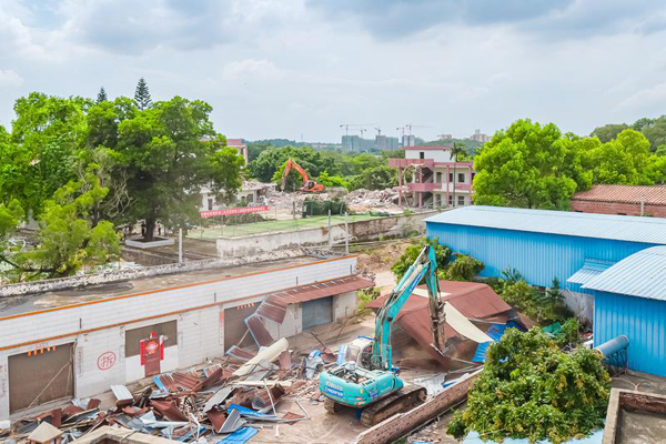 白坭镇横村片区村改项目清拆现场,两台大型机械正在对该区域内的厂房进行清拆。/佛山日报记者王澍摄