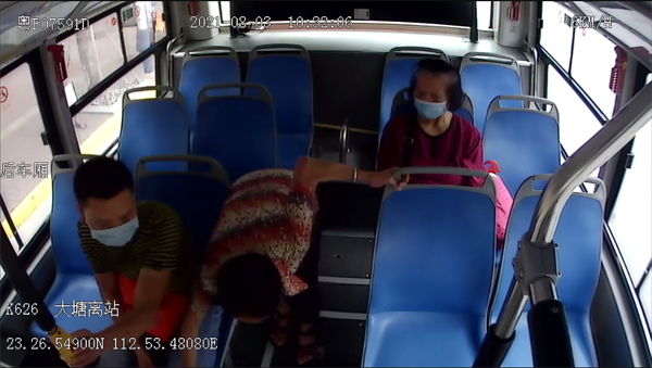 当天上午,三水粤运K626线公交驾驶员钟武从三水汽车站发车开往南山镇。10点32分,当车辆到达大塘公交站,坐在后车厢右侧靠窗前后座位的一对70多岁老夫妇准备在此下车。