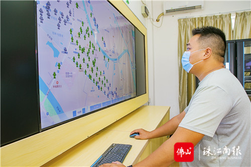 永丰村委会三楼的智慧安全社区监控终端可以对辖区所有安装了智慧安全系统的设施一目了然,并能够完成远程操控。/珠江商报记者朱德文 摄