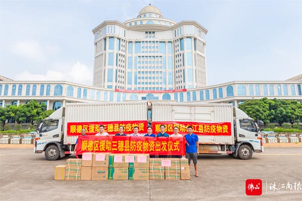 8月8日,顺德区援助台江县、三穗县防疫物资出发仪式在顺德区政府行政大楼前举行。/珠江商报记者林安迪摄