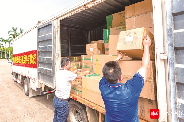 8月8日,顺德区援助台江县、三穗县防疫物资出发仪式在顺德区政府行政大楼前举行,工作人员将各类防疫物资搬运上车。/珠江商报记者林安迪摄