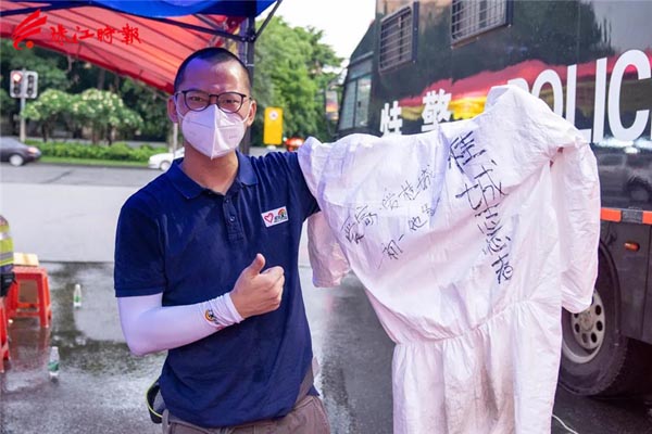 林海全是桂城义工联秘书长,在5月底成为了抗疫一线的志愿者,在桂城封闭管理区域坚守了近一个月,最长一天的值守时间长达16小时。他的防护服背后,写有“初一他爸”的字样。在参与疫情防控前,林海全把自己将近两岁的儿子“初一”送回了老家,闲暇之余他每天都要和孩子视频。但在投身抗疫服务时,林海全完全没有时间打视频电话,他说,那段时间自己“真的很想初一”,最大的期待就是疫情早日结束、父子尽快团聚。