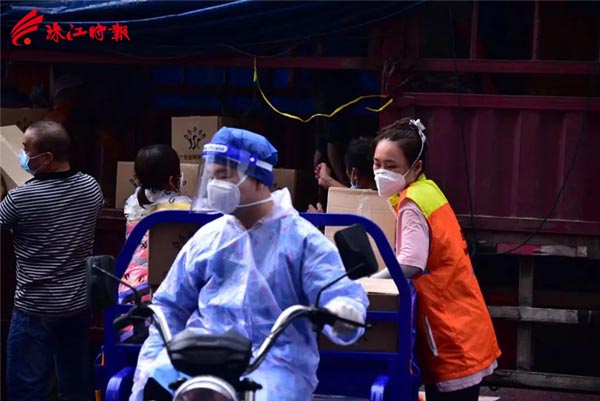 梁雅茹参与物资搬运工作。