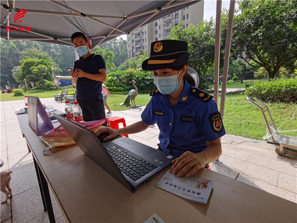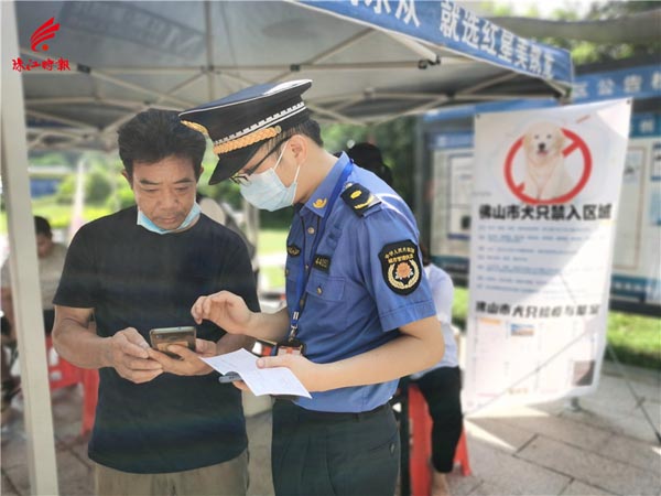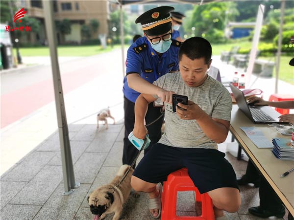 丹灶镇综合行政执法办执法人员采取一对一指导协助居民完成犬只备案登记。