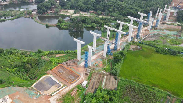 连接富龙西江特大桥的高架桥正在建设中,图为高架桥桥墩。/佛山日报记者赖基润摄