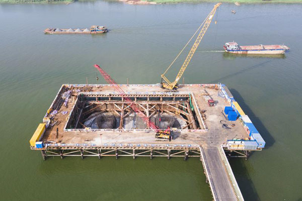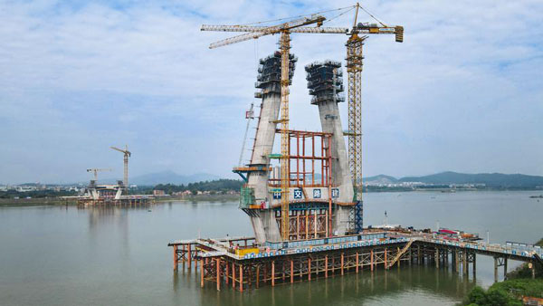 正在建设中的富龙西江特大桥。该桥将实现三水区与佛山中心城区的快速对接,辐射带动佛山西部片区交通融合、产业融合和城市融合。/佛山日报记者赖基润摄