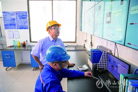 王韬在公司中控室内与同事交流讨论。王韬是华南理工大学材料学博士,2016年来到高明区明城镇的广东拓普合成科技股份有限公司任技术总监。