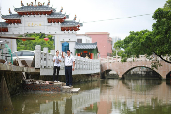湖涌村纪委书记罗啟鑑在检查河道护栏建设情况。/佛山日报记者张弘弢 摄
