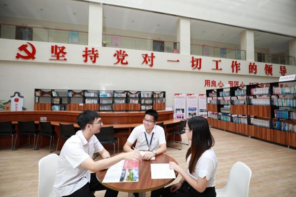 紫南村纪委书记邱永盛与村委会工作人员谈心谈话。/佛山日报记者张弘弢 摄