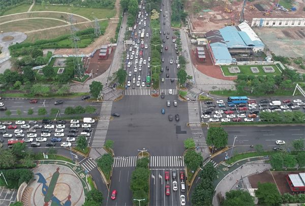 同样,在不远处的海五路—桂澜路路口,同样承载着较大的交通压力。桂澜路是南海中心城区南北向两条主干道之一,日均交通量为7万~8万pcu/日(pcu指换算后的当量小汽车交通量)。