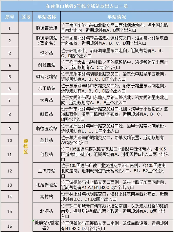 佛山地铁3号线全长约69.5公里,线路起自顺德客运港站,止于科技学院站,在顺德境内设顺德学院、逢沙、创意园、驹荣北路、东乐路、大良、新松、顺德医院、荔村、伦教、三洪奇、北滘新城、高村、北滘、美旗、水口、大墩、东平站点。未来可换乘的轨道交通线路多达13条,其中多条可换乘进入广州,将成为佛山轨道线网中最便捷的“南北大动脉”。