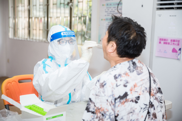 丽豪社区居委会二楼,医务人员正在为前来做核酸检测的市民采集咽拭子。/佛山日报记者王伟楠 摄