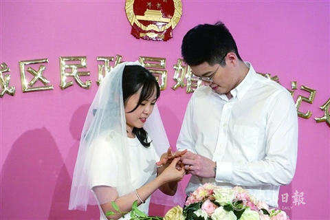 ▲昨日,禅城区民政局婚姻登记处,一对新人为对方戴上婚戒。/佛山日报记者黄瑶摄