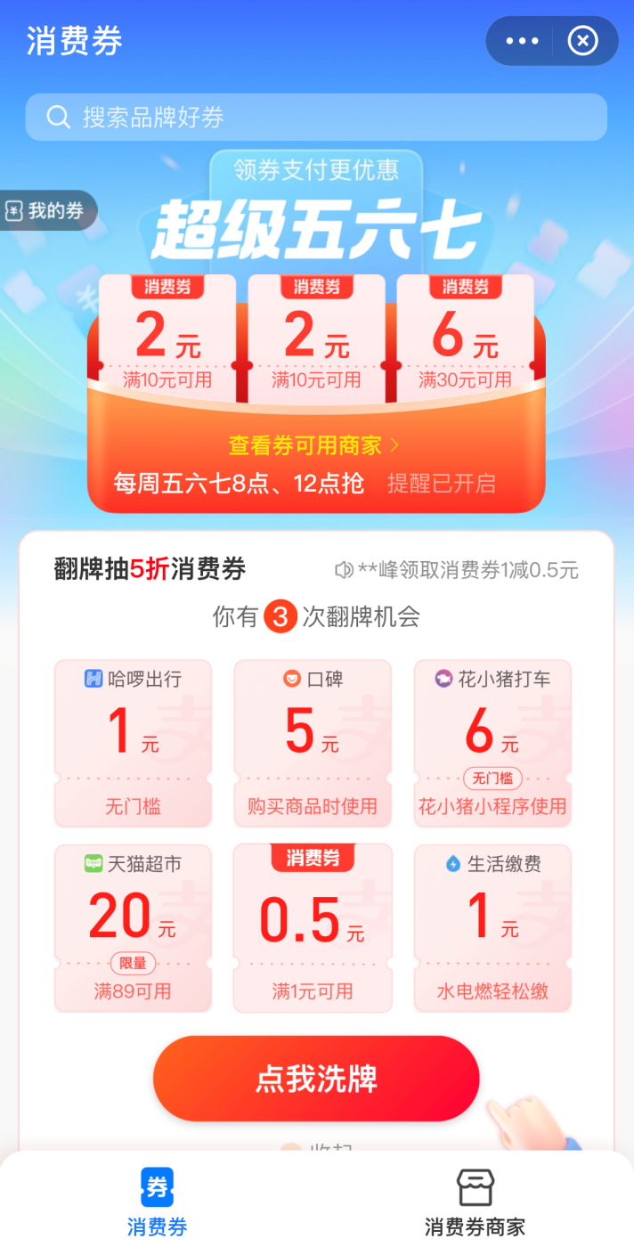 支付宝搜索超级567或消费券,即可查看领券 。