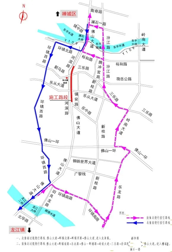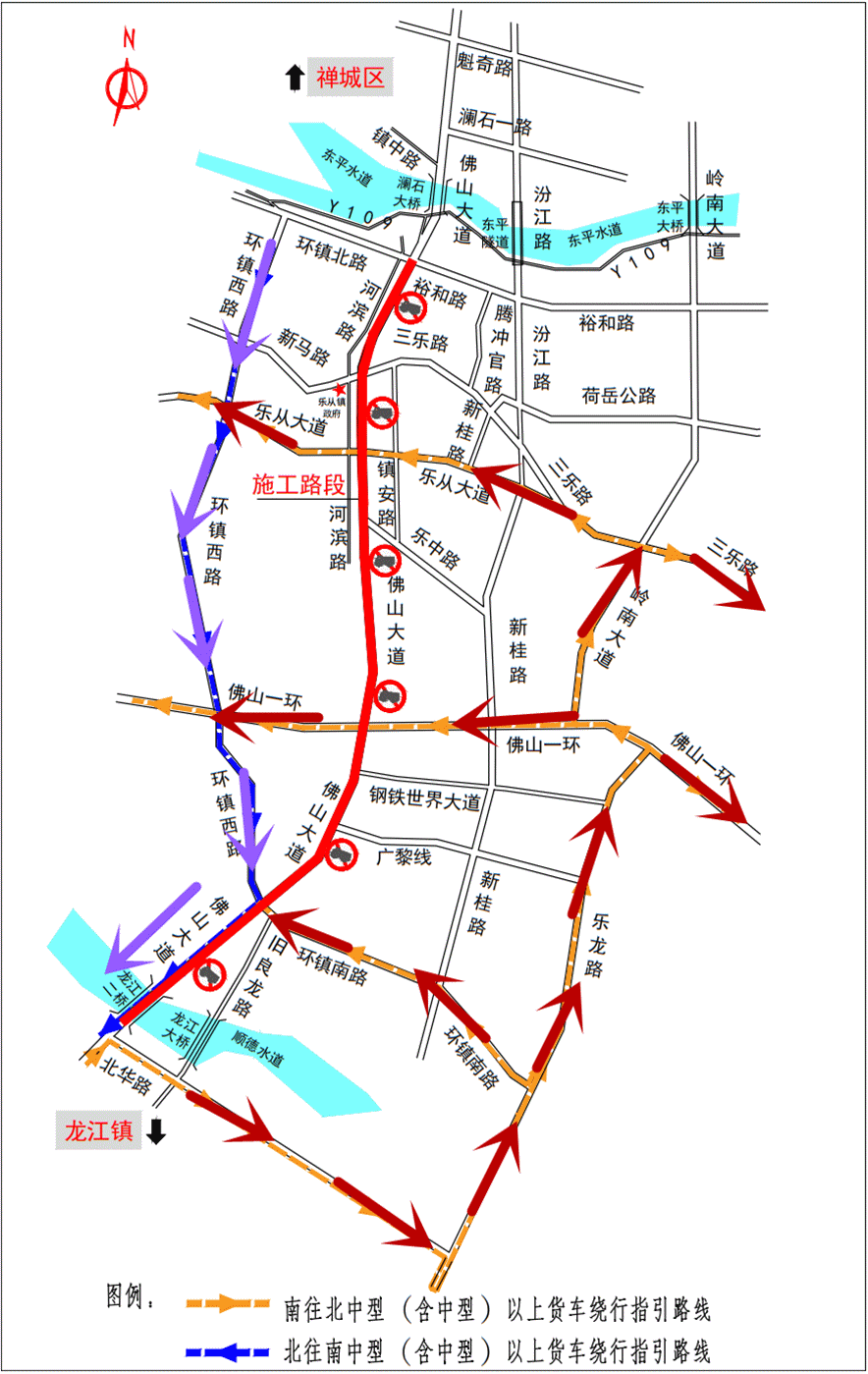 (1)往龙江(北往南)方向的车辆:佛山大道 → 环镇北路 → 环镇西路 → 佛山大道 → 龙江