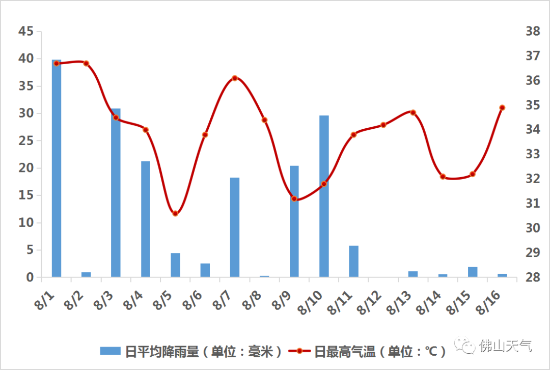 佛山8月以来日平均降雨量及日最高气温图
