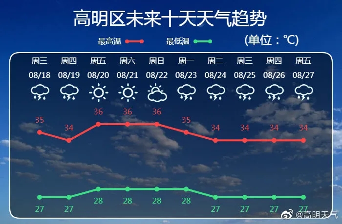 高明区气象台8月17日预报,预计高明未来十天前期多云为主,局部有雷阵雨,气温上升;中期天气晴热;后期雷雨天气趋于频繁。