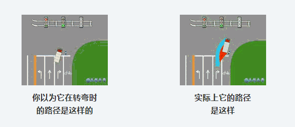 “右转危险区”形状呈弯月状,也就是大货车内轮差。内轮差,是指车辆转弯时,前内轮转弯半径与后内轮转弯半径之差,由于“内轮差”的存在,大型车辆在转弯时,前、后车轮的运动轨迹不重合。