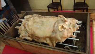 “均安蒸猪”被称为顺德几大名菜中的“贵族”。均安蒸猪最大的特色就是一次蒸整头猪,制作工艺讲究生猪的宰割的刀工,特殊工艺制法和蒸煮火候。均安蒸猪,关键是要有一套大型的烹具,一个超大的农家土灶,一个特大口径的铁锅,还要有一个长方形的木盆。制作时先把宰好洗干净的全猪起骨,然后用精盐、白糖、黑糊椒粉、五香粉等佐料涂遍猪的内外,体外是不用加任何染色素的。涂抹过后腌大约两小时,然后用旺火隔水蒸它一小时,就可以食用了。全猪熟肉皮爽肉滑,肥而不腻。