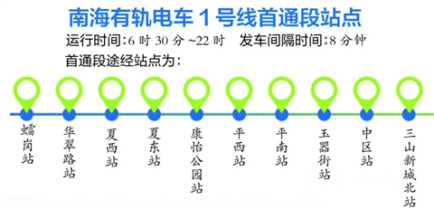 据佛山地铁介绍,8月18日,南海有轨电车1号线的开通时间为12时~22时,8月18日以后,全天运行时间为:6时30分~22时。开通初期,工作日、周六日全天发车间隔为8分钟,首通段途经站点为:虫雷岗站、华翠路站、夏西站、夏东站、康怡公园站、平西站、平南站、玉器街站、中区站、三山新城北站,总计10座车站,其中地下站4座,地面站1座,高架站5座。