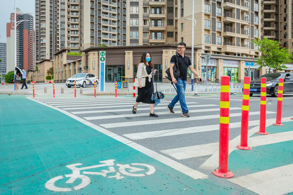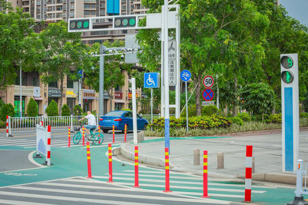 8月18日,位于云东海街道鲁村路和映云路交叉的十字路口,4个方向的绿色非机动车道带格外显眼,铁栏、胶柱标线等设施分隔了机动车道和非机动车道,实现了机非分离。记者在十字路口观察到,1分钟大约有10余台自行车、电动自行车经过路口。“有了隔离护栏,有了专属车道,骑单车更加放心和安全。”市民马先生每天骑共享单车经过路口至少4次,他说,这边车流挺多的,以前即使靠边骑行也总会担心出现交通事故。