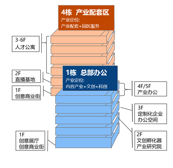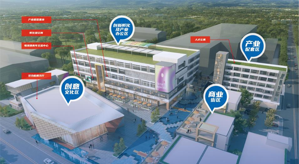内部规划建设创新孵化及产业办公区、创意文化区、产业配套区和商业街区四大空间功能布局。