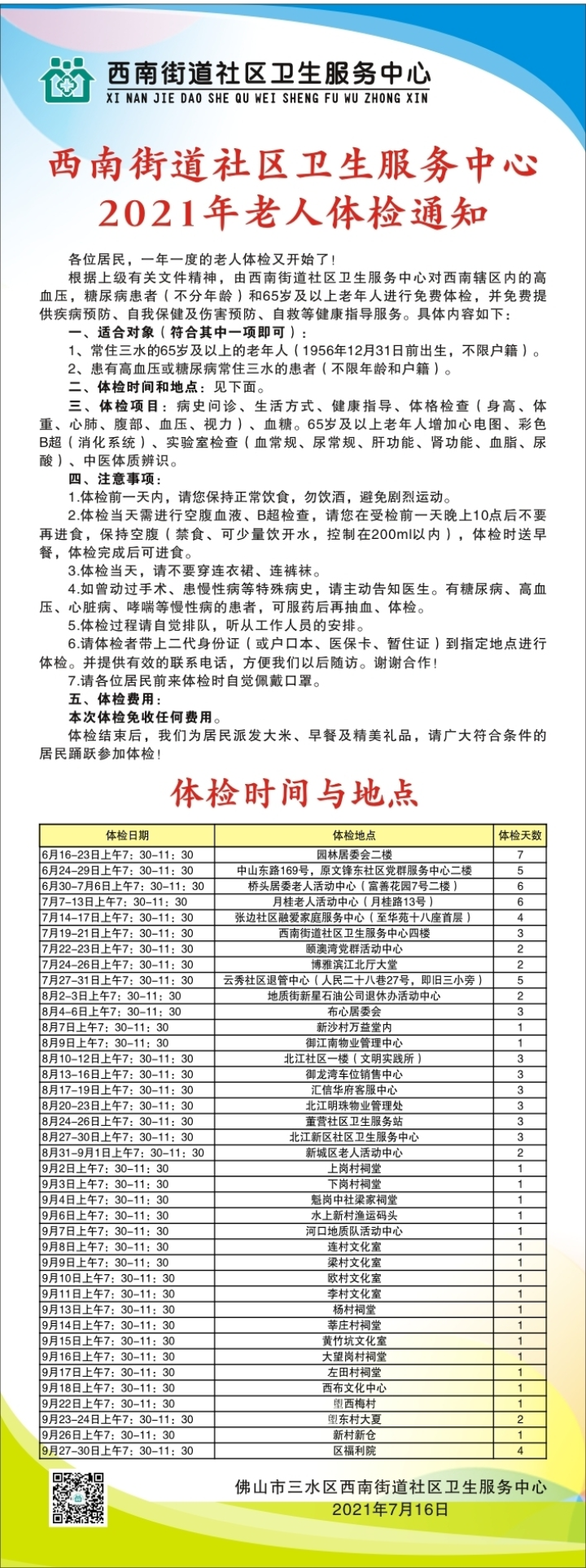 《西南街道社区卫生服务中心2021年老人体检通知》具体如下: