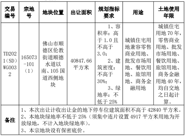 地块位于佛山市顺德区伦教街道顺德水道以南、105国道西侧,占地4万方,起拍价10.4亿,折合起拍楼面价为8500元/㎡。无保密底价,采用价高者得的竞拍模式。