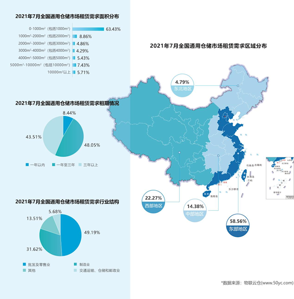 全国32个城市通用仓储市场需求总面积约100.50万㎡,较上月增长16.00%。市场需求主要集中在东部地区,约占全国通用仓库需求的58.56%;西部地区、中部地区、东北地区相对较少。批发和零售业为7月市场需求主力军,占比达49.19%;制造业需求有所上升,环比上升2.35%。全国32个城市仓储市场中1,000㎡以内仓库租赁需求相对较多,占比约63.43%,较上月增长5.53%;4,000㎡-5,000㎡以上租赁需求相对较少,仅占4.29%。7月仓储市场租赁需求租期一至三年需求上升明显,三年以上长租需求有所下降。