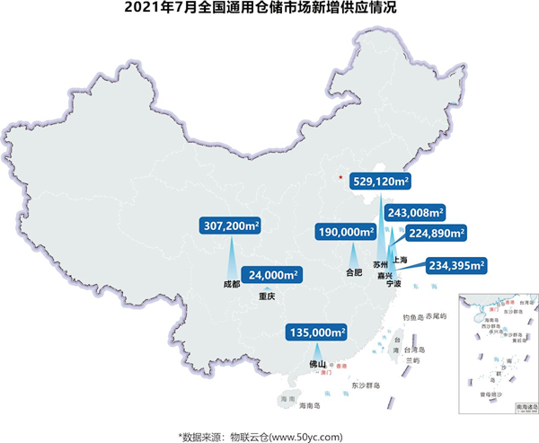 物联云仓延续往期《报告》成果,不断扩大统计范围,加强仓储市场分析,发布《2021年7月中国通用仓储市场动态报告》。2021年7月,物联云仓全国在线仓库面积新增266.46万㎡,总面积超3.33亿㎡,较6月增长0.81%;在线可租面积超4741.88万㎡,较6月增长4.31%。仓库资源覆盖32个省份,229个城市,7,569个园区。