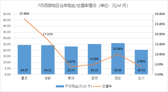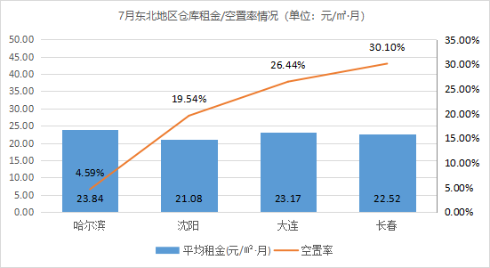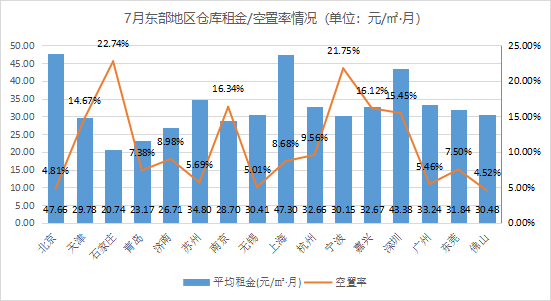 全国32个城市通用仓库平均租金为28.10元/㎡·月,环比上涨1.59%。其中,东部地区仓库平均租金(32.73元/㎡·月)高于西部(23.91元/㎡·月)、中部(23.60元/㎡·月)、东北(22.65元/㎡·月)地区。相较6月,东部、中部、东北地区仓库平均租金有所上涨,涨幅大于1.5%;西部地区仓库平均租金相对稳定,增(降)幅±1%以内。