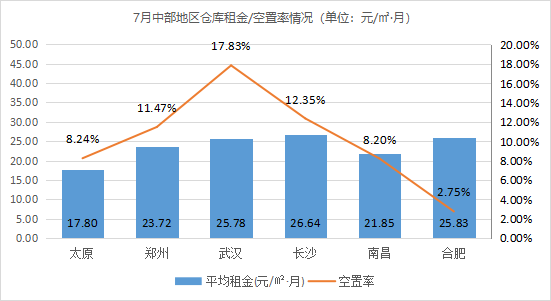 全国32个城市仓库平均空置率为11.98%,环比上升0.69个百分点。其中,东北地区仓库空置率(20.16%)远高于西部(11.23%)、东部(11.10%)、中部(10.13%)地区。相较6月,东部地区仓库空置率有所上升,升幅为1.39个百分点;东北、中部、西部地区仓库空置率相对稳定,升(降)幅变化在±1个百分点以内。