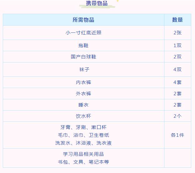 携带物品要求,详见学校下发的《初一新生适应性训练报到须知》。