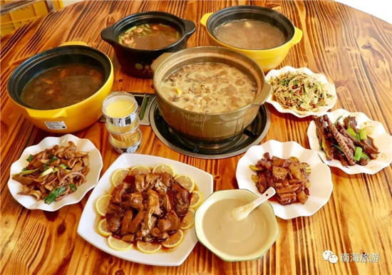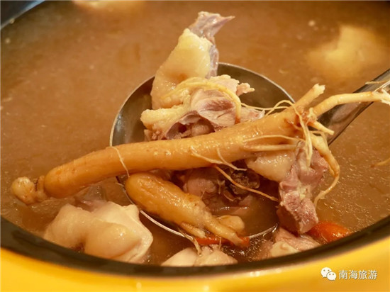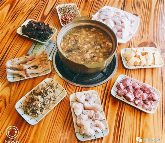 里水百年传统菜式→醋意坊的招牌是里水传承百年的醋米鸡。自制香醇米醋搭配走地鸡、猪手、排骨、黄豆、花生、番薯、梅菜、木耳、鸡脚9样食材。将米醋熬至浓绵后再按照不同食材所需的烹饪时间分别下锅,细火熬足一个钟。