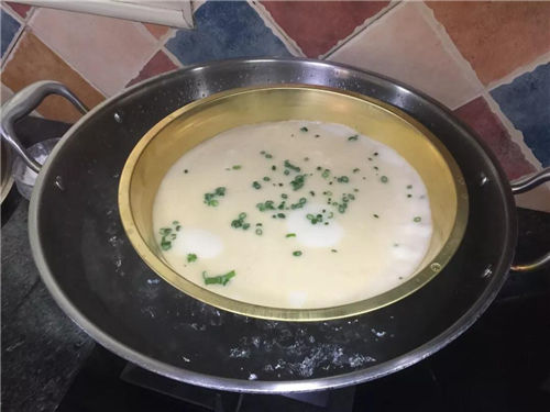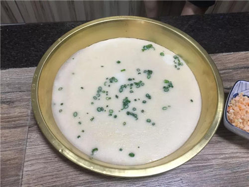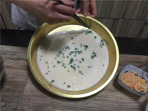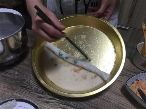 接着,把打好的米浆浇在已经涂上一层花生油的铜盘里,撒上一点葱花,直接放在水烧开的铁锅里蒸上一分钟左右,拿出来用筷子卷成粉条,大功告成,铜盘粉可以上碟食用了。
