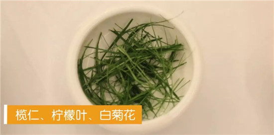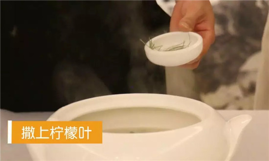 最后在羹汤中依次撒入柠檬叶、炒香后的榄仁、白菊花。