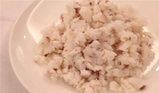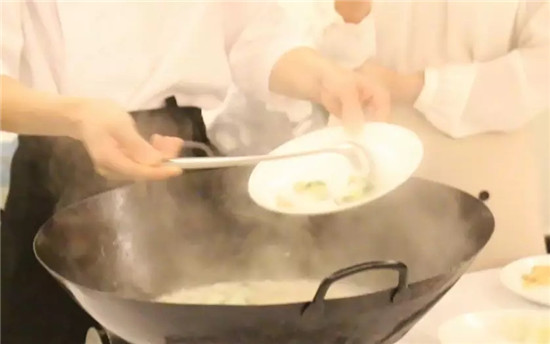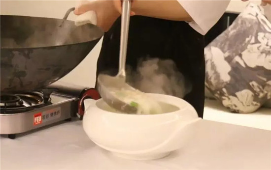 使用山坑鲩为主料,将其腩肉两边略煎,去骨拆蓉,鱼骨熬汤2小时;