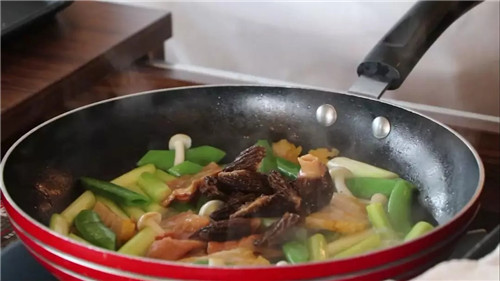 放少油热锅,加入甜椒翻炒,随后放入所有备用食材一起翻炒。