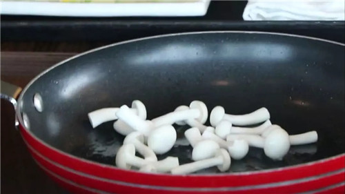 用少许油分别清炒芦笋和白玉菇,白玉菇需炒至金黄色,加入少许清鸡汤,出锅滤水备用。