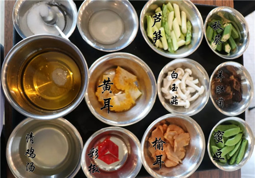 食材:羊肚菌 榆耳 黄耳 芦笋 蜜豆 秋葵 白玉菇