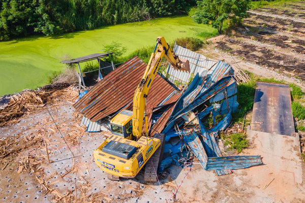 现场挖掘机正在拆除莘田晒板厂的厂房设施。佛山日报记者王澍摄