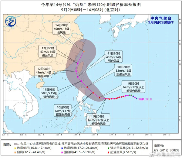 “灿都”爆发力之强,在秋台风界非常少见。9月9日08时其中心位于距离我国台湾省鹅銮鼻东南方向约1040公里的洋面上,中心附近最大风力62米/秒(17级),预计“灿都”将以每小时15-20公里的速度向偏西方向移动。
