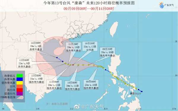 相比之下,“康森”在菲律宾岛屿上,虽然云系范围较为宽广,但结构比较松散,台风眼不太清晰,中心风速只有30米/秒。
